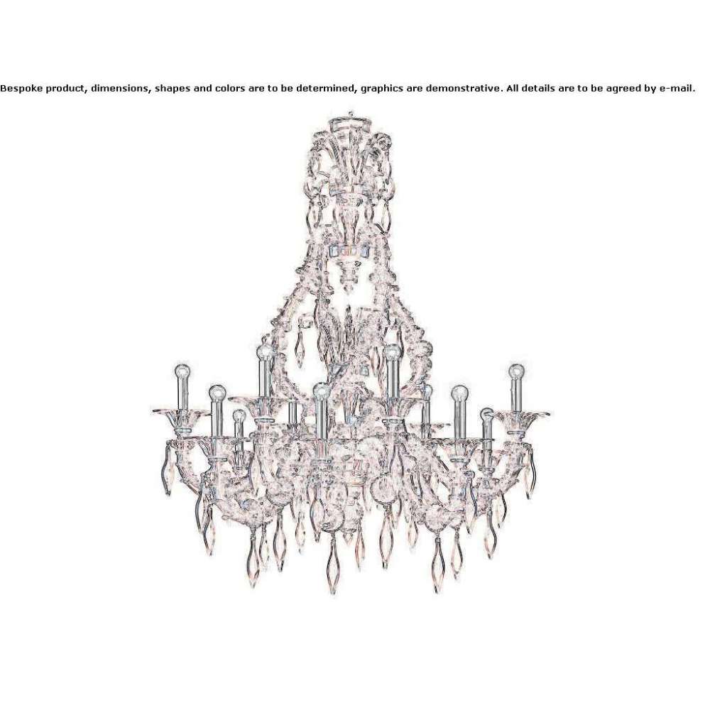 Chandeliers full of specific decorations, such as ampoule-shaped pendants, inflatable lips in the same color, or pyramids (rolled points). The twisted main frame is a unique feature that creates an extraordinary twist, also emphasized by an unusual crack in the central trunk.