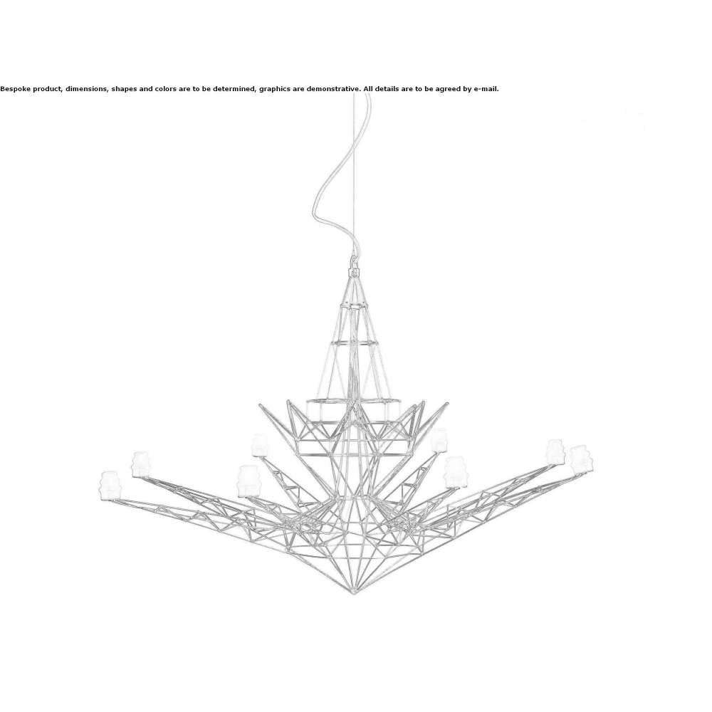 A classic chandelier with arms, stripped of any decorations: only the frame remains. Made by hand by welding hundreds of parts, it combines an innovative image with a semi-traditional production process. Eight small diffusers made of etched, blown glass propagate intense light.