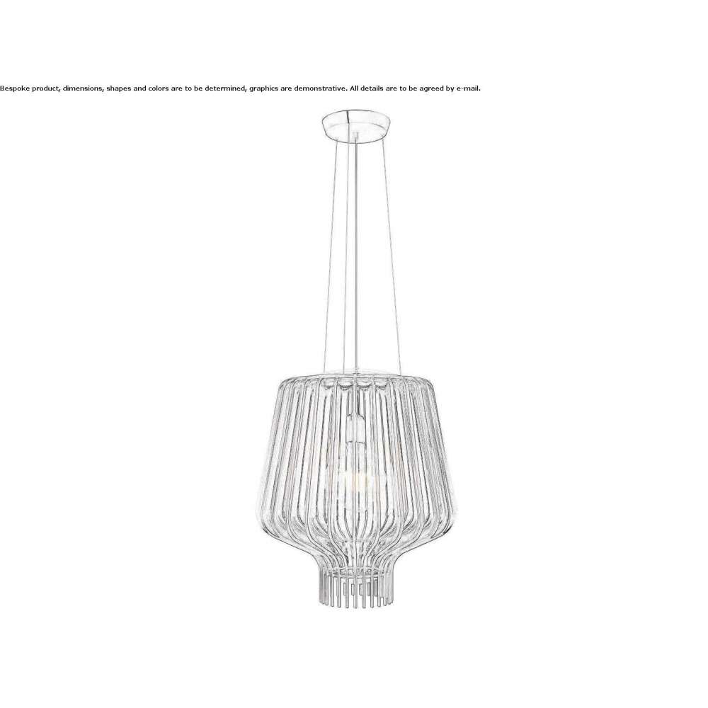 SAYA F47 A09 is a hanging lamp with a transparent blown glass diffuser and a rust metal structure. TECHNICAL DATA Voltage: 220-240V Light source: E27 1x150W IP class: IP20Saya is a new collection of hanging lamps designed by Gio Minelli and Marco Fossati. The inspiration for this project was a story about a journey halfway between East and West, where the aesthetics and memory of distant cultures combine with the ancient Venetian tradition of blown glass in cages. The shape is inspired by a large dewdrop that settles and flows down a series of metal wires that interrupt its descent, closing and giving the impression of being suspended. The cage gains a new aesthetic value, becoming the hero of the project. The large body of blown glass is modeled without deformation, creating a perfect balance between light and decoration. The collection consists of several hanging lamps in three different shapes. Blown glass cage diffusers are available in clear and glossy white. The glass supporting structures are made of details with bronze, gold and chrome finishes. Main voltage electrification for halogen, fluorescent and LED lamps.