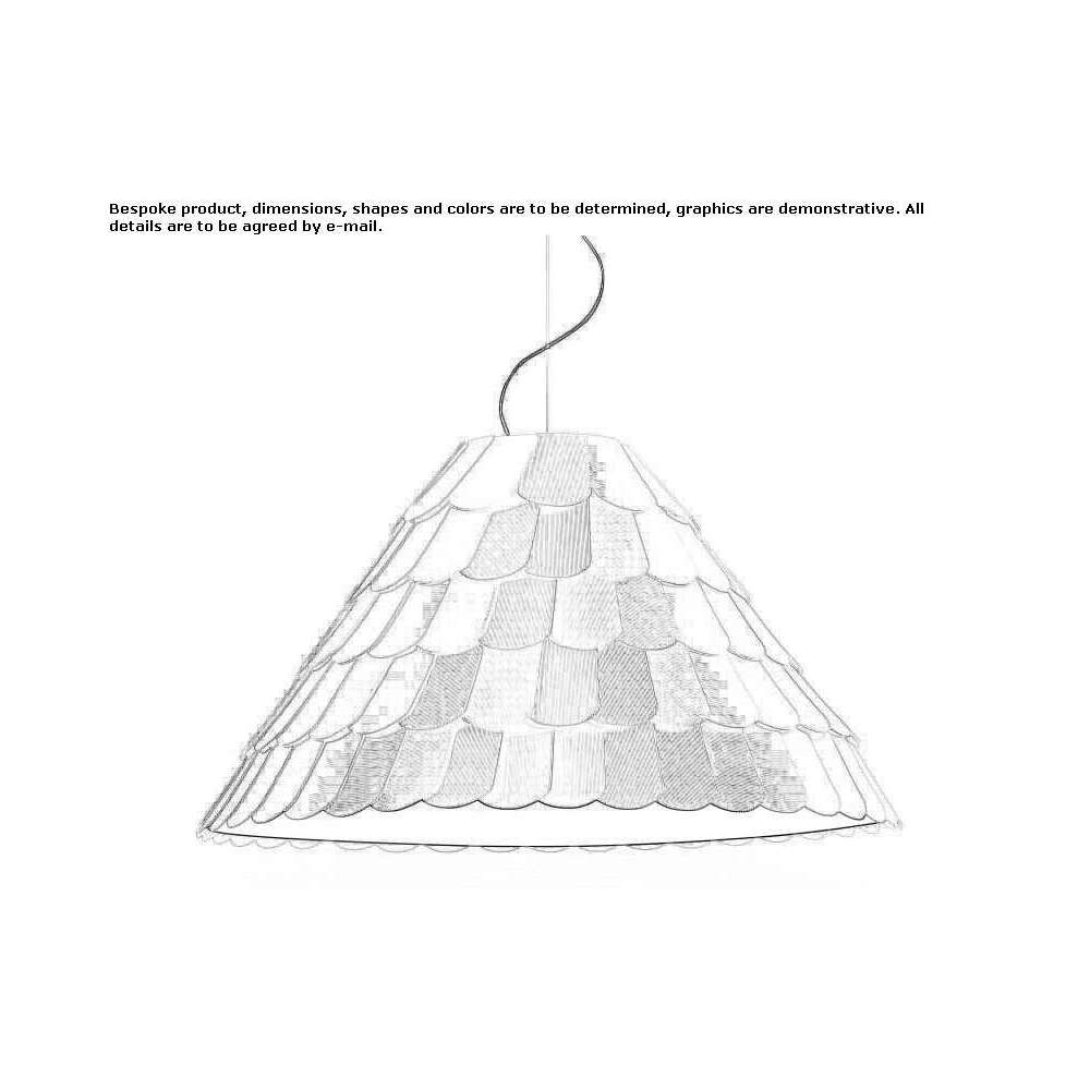The collection consists of hanging lamps for indoor use, in five different shapes, which can also be mounted directly on the ceiling rose by simply shortening the cables. The frame is covered with scales made of a semi-rigid rubber material, in four different colors (white, gray, brown and green), while the round diffuser is made of white fabric. The lamp is powered by the mains and is suitable for use with halogen and fluorescent bulbs.