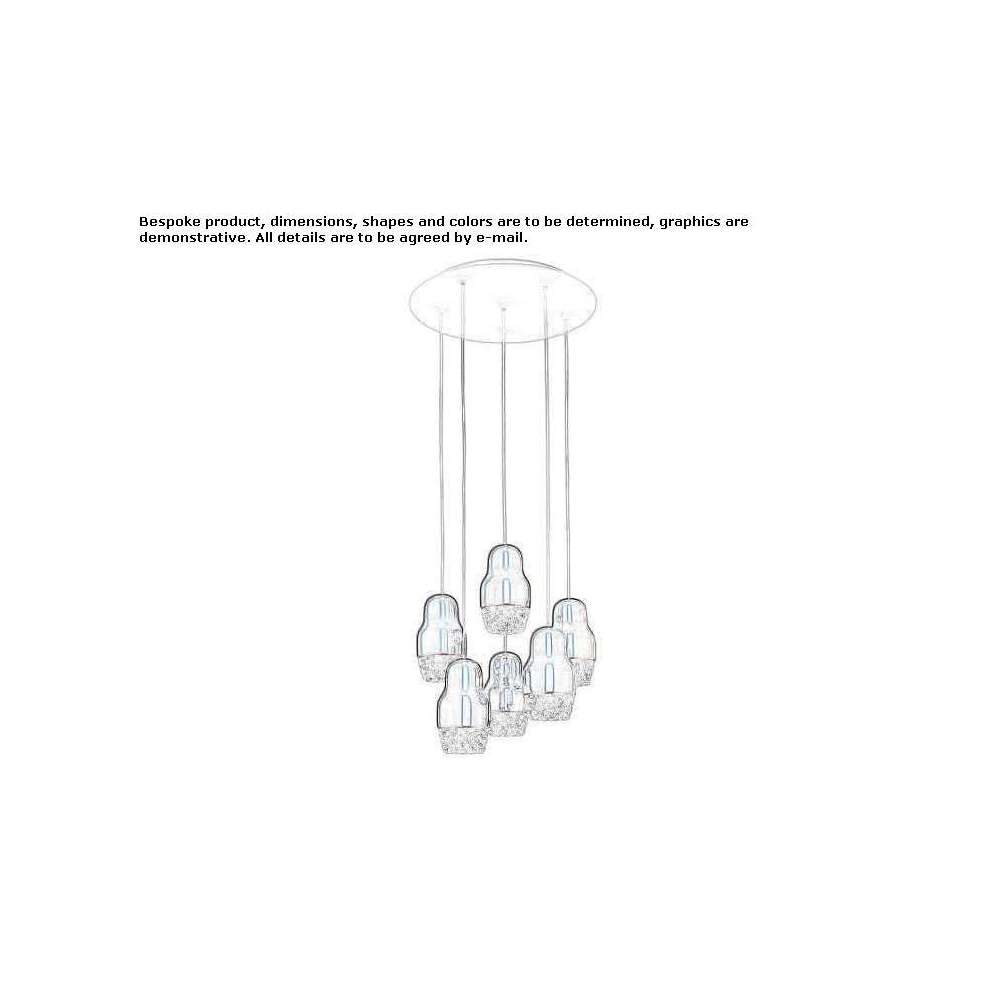 Types and sizes: Suspended and spotlight versions. A suspended version with one lamp, a set of three, six and twelve lamps and a version with seven lamps in a row are available. The suspensions have a total height of 300 cm; the diffuser is 19 cm high and 10.8 cm in diameter; the maximum diameter for the suspended model with one lamp is 13 cm, 30 cm for the suspended model with three lamps, 42 cm for the suspended model with six lamps and 60 cm for the suspended model with twelve lamps. The suspended model with seven lamps in a row is 120 cm long and 16.8 cm wide. The reflector is 5 cm high and has a maximum diameter of 11.6 cm.