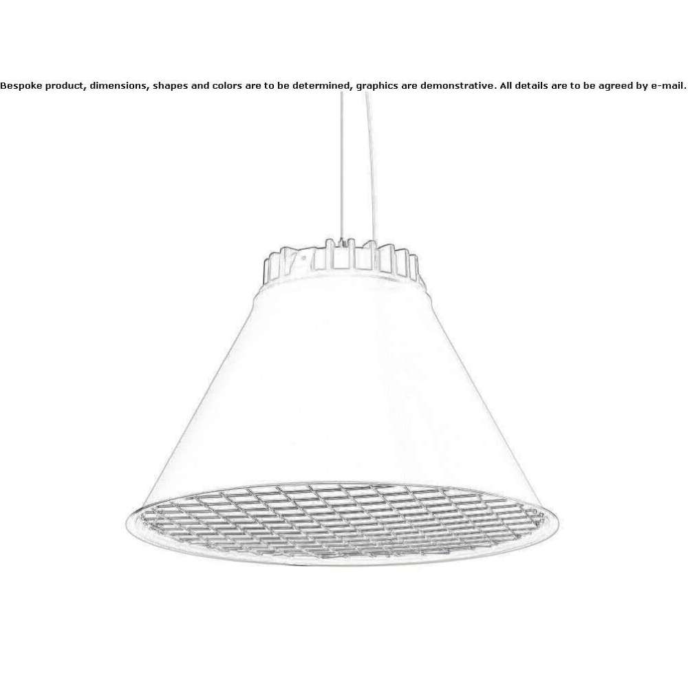 Painted aluminum in black (RAL 9005) or beige-gray (RAL 7006) as standard. Inner lampshade made of white painted aluminum. The E27 model has an internal shade made of frosted glass. LED models can be equipped with an internal frosted glass diffuser. On request, we can make it without a net. Other colors on request. Information about LEDs System power 18W or 32W. The luminous flux of the luminaire is 1166 LM or 2120 LM. CCT 3000K. SDCM 3. CRI >80 Installation Hanging on cable. Connection Terminal block 3x4mm2 when HFF 5x4mm2. Design Thomas Bernstrand 2016.
