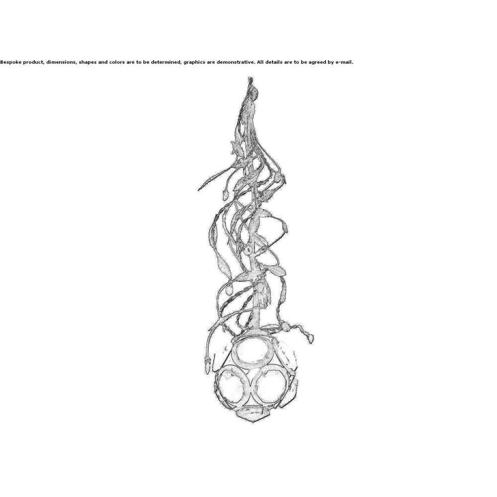 A sphere composed of faceted octagons of Czech crystal that resembles a snowball. The structure that suspends it is a combination of woven iron rope, olive leaves, and smoky and milky white crystals.