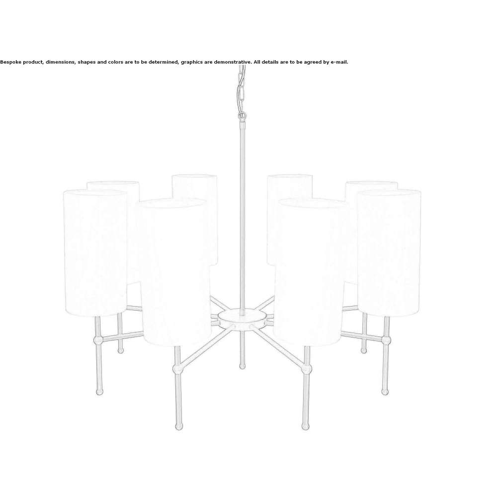 The ARIZONA 8 ARM chandelier consists of eight brass sleeves that come out of a brass cylindrical center. Each bushing extends horizontally before meeting the brass ball joint. Eight more brass bushings extend vertically through each ball joint. Each vertical sleeve holds a brass lamp socket and a tall, narrow fabric shade in place. Another brass sleeve is attached to the central body of the contemporary Arizona chandelier. This sleeve is suspended from the supplied ceiling rose using a matching lighting chain.