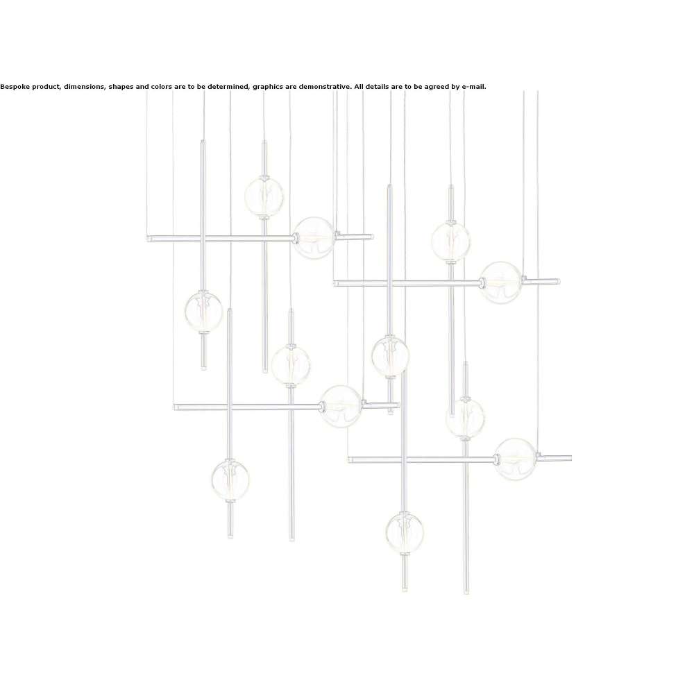 Mikado S12 is a Pyrex-colored LED hanging lamp. 12 tinylight 24W - 3500°K 24 Vdc - 7200 lm Finish | black nickel, shiny gold. Other finishes on request. Color | Pyrex balls in metallic black nickel or metallic shiny gold. Other colors on request. Details | heat-resistant balls with metallic decoration: when the suspension is turned off, no light source is visible; when the suspension is on, you can see the LED filament
