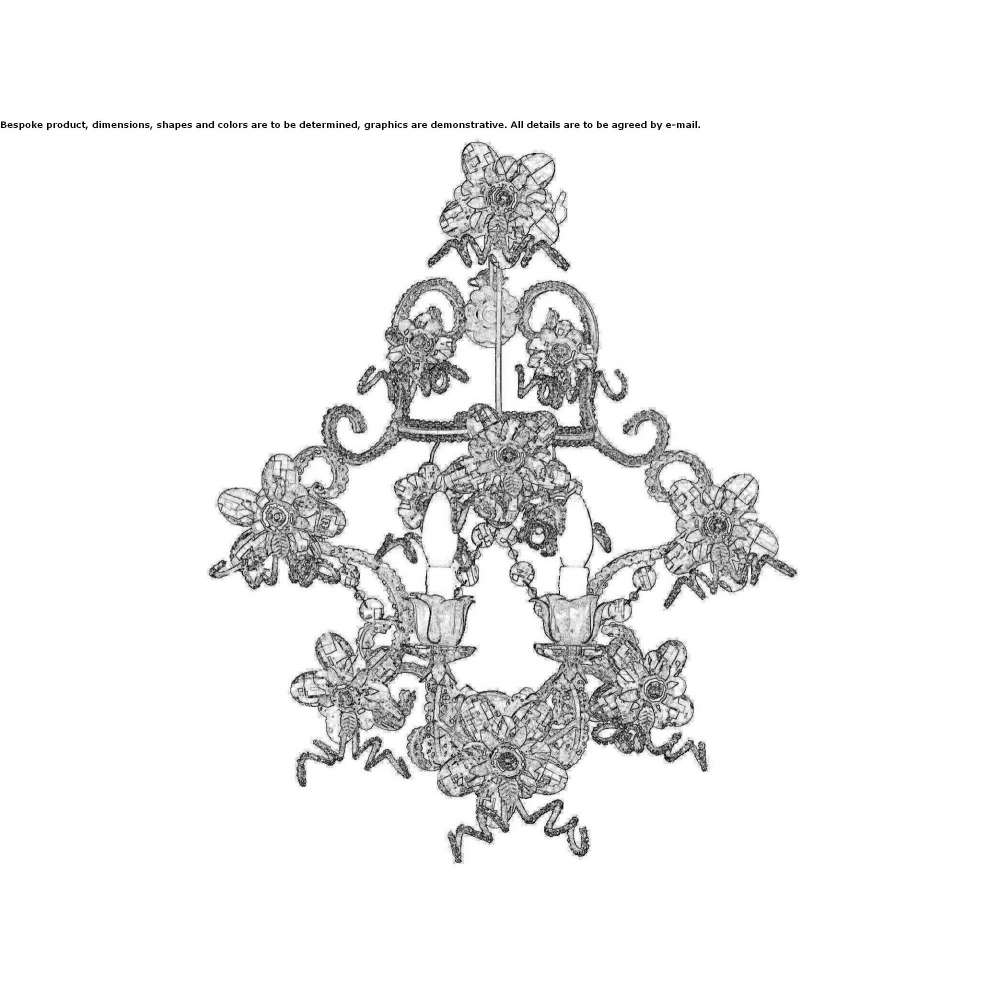 A288 is a 2-light wrought iron wall lamp with colored Czech crystal, transparent Czech crystal, porcelain, strands of transparent and colored pearls.