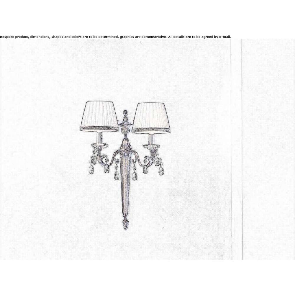 Primadonna A2 is a wall lamp with a metal structure and cast brass decorations. Pongè lampshades, crystal pendants. 16XE14X10 W - USA: 16XE12X40 W (not included)PRIMADONNA 6020 - Metal frame, made of noble polished gold or elegant polished gold, combined with brass decorations. A series of clear crystal pendants enhance the soft light diffused by the pongè lampshades.