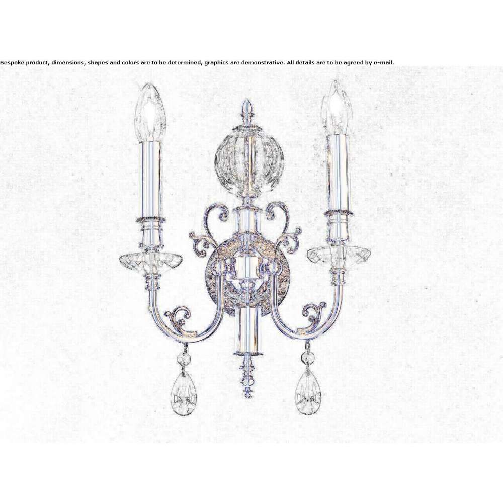 Zaira A2 is a wall lamp with a metal frame and brass casting. Crystal pendants and bowls.