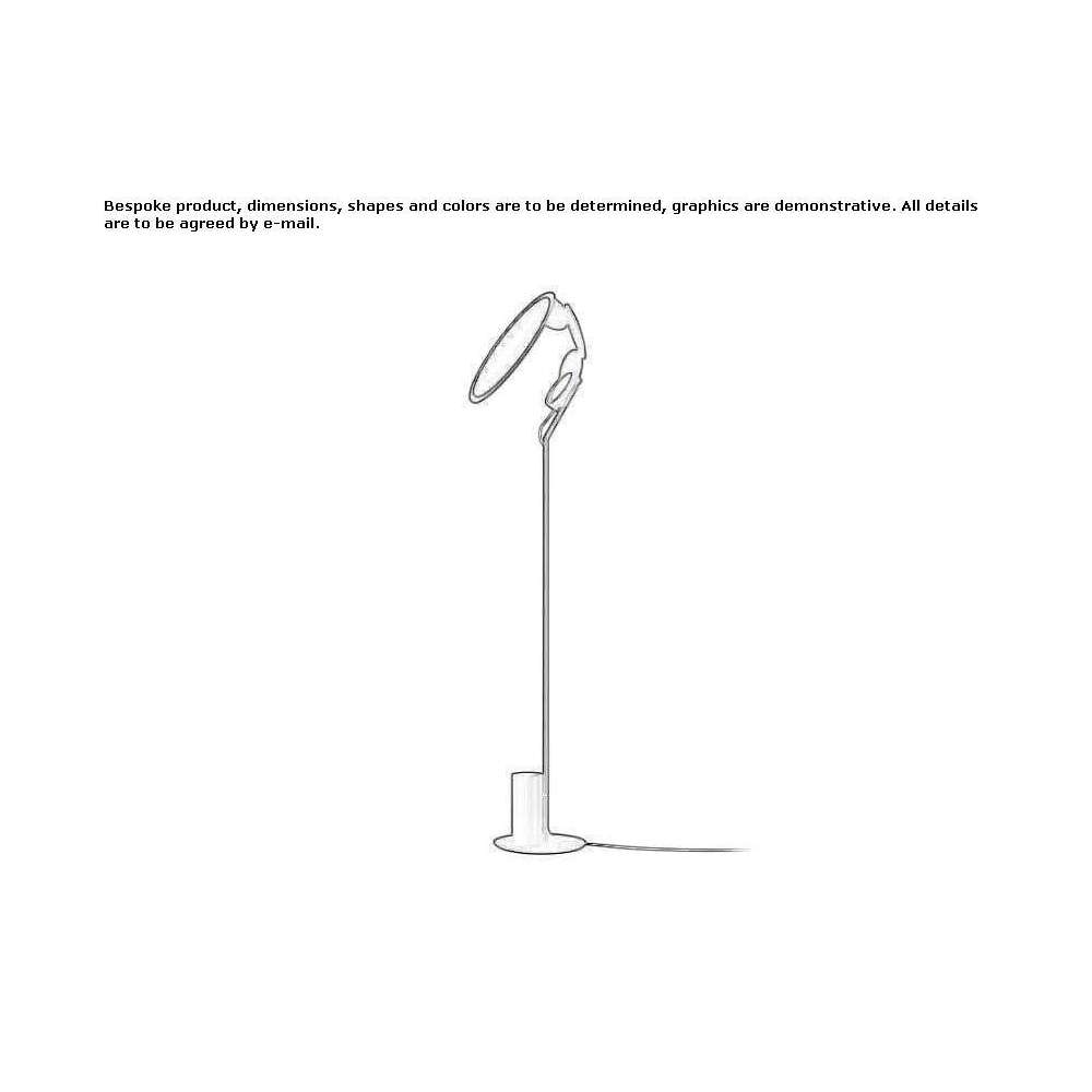A laser-cut aluminum structure assembled at several points connects two elements: a light source embedded in a round metal base and a ring on which a translucent diffuser disk is mounted.