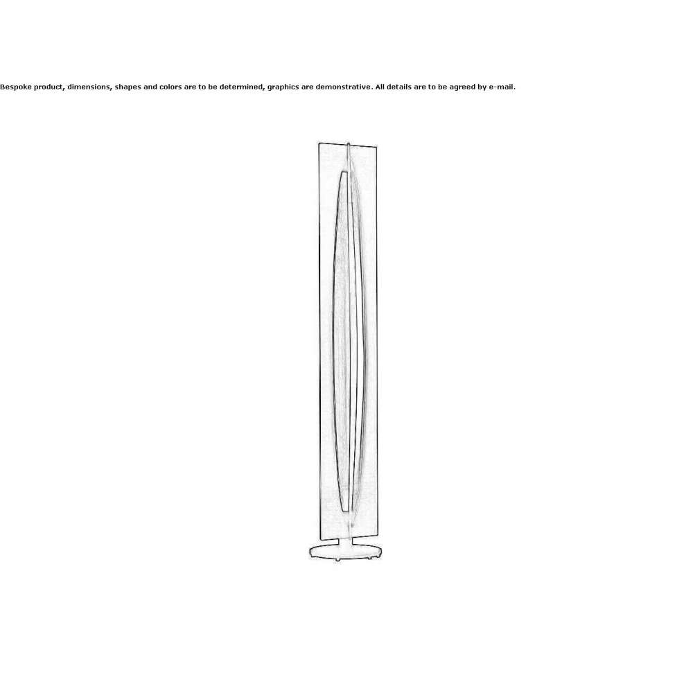 Floor lamp made of extremely transparent, 5 mm thick, bent glass, finished with gold, on a rotating base made of etched, lacquered glass, creta color. Metal bracket in brass finish (104M). Vertical bar made of oxidized brass with LED STRIP (30W 12V 2700-3000K).