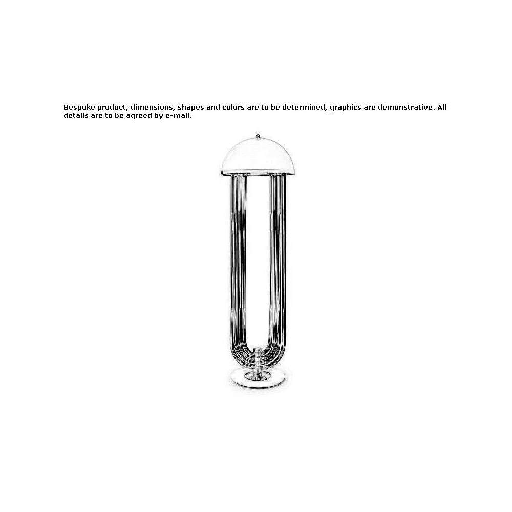 The Turner floor lamp was inspired by Tina Turner's electrifying dance moves. Perfect for any hotel design, this art deco floor lamp will fit perfectly into a modern lobby entrance or next to a mid-century armchair. This mid-century floor lamp has five large arches made of brass and a hemispherical top cover in aluminum lacquered in gloss white or any other RAL color of your choice.