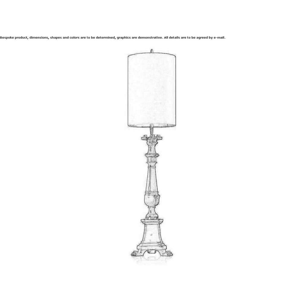 Z573 is a hand-engraved and glazed majolica floor lamp with natural brass details and a velvet lampshade.