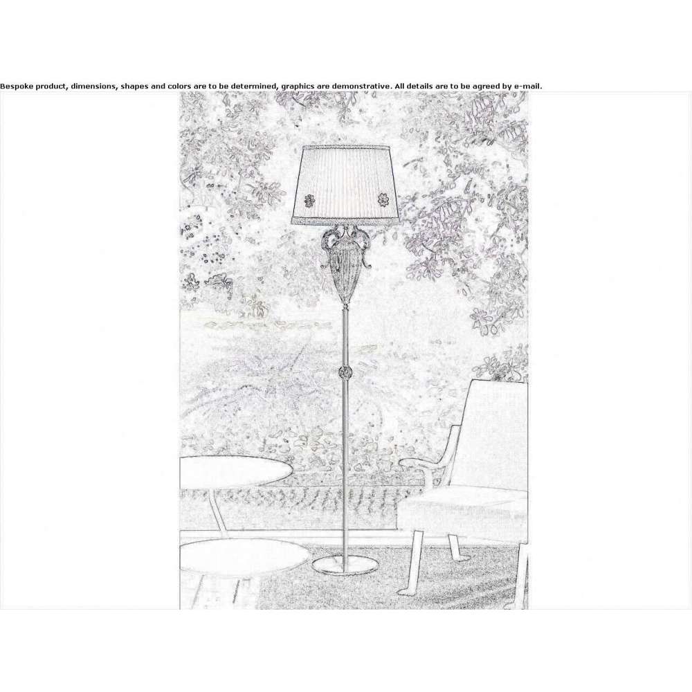 Primadonna STL1 is a floor lamp with a metal structure and cast brass decorations. Pongè lampshades. 1XE27X20 W - USA: 1XE26X60 W (not included)PRIMADONNA 6020 - Metal frame, made of noble polished gold or elegant polished gold, combined with brass decorations. A series of clear crystal pendants enhance the soft light diffused by the pongè lampshades.
