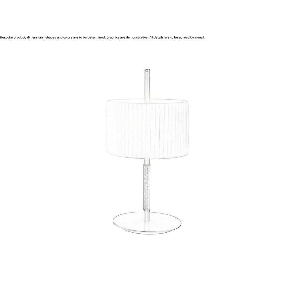 Night lamp with iron construction available in satin nickel, nickel with dark leather trim and nickel with light leather trim. The lampshade is available in cotton and a white or cream translucent polyester blend, hand-wrapped with ribbon. Includes a polycarbonate diffuser.