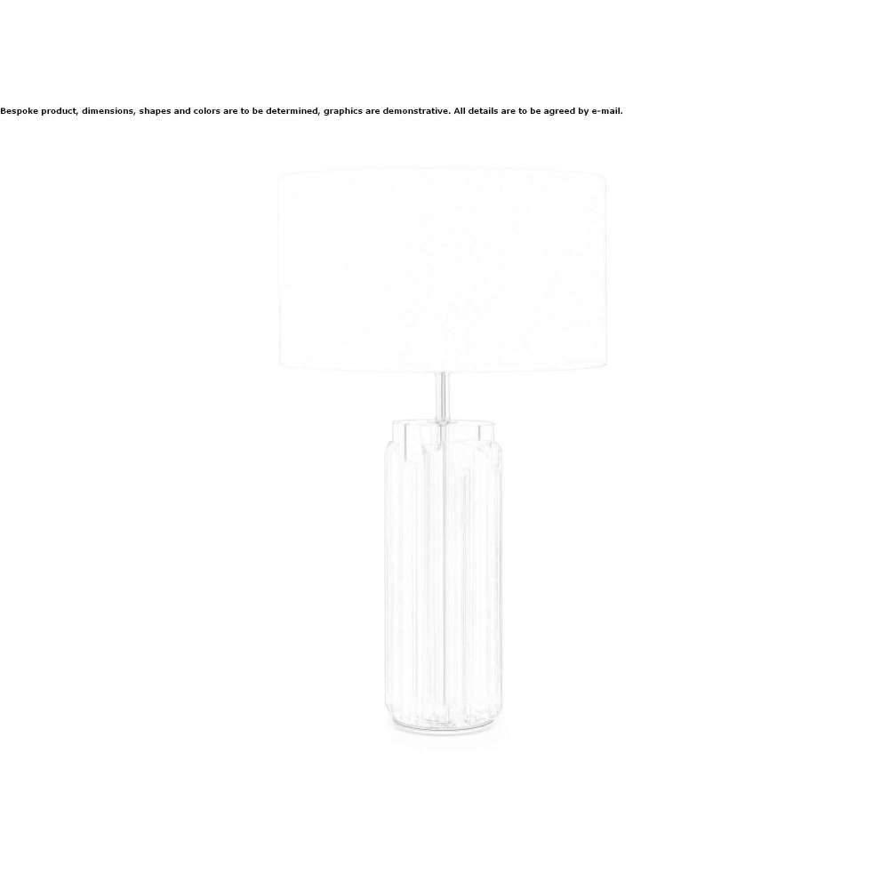 Muse is a table lamp with a metal base complemented by carved cast glass in three shades: smoky, powder pink and transparent. Cotton lampshade in white. Light source - lamp with an E27 base.