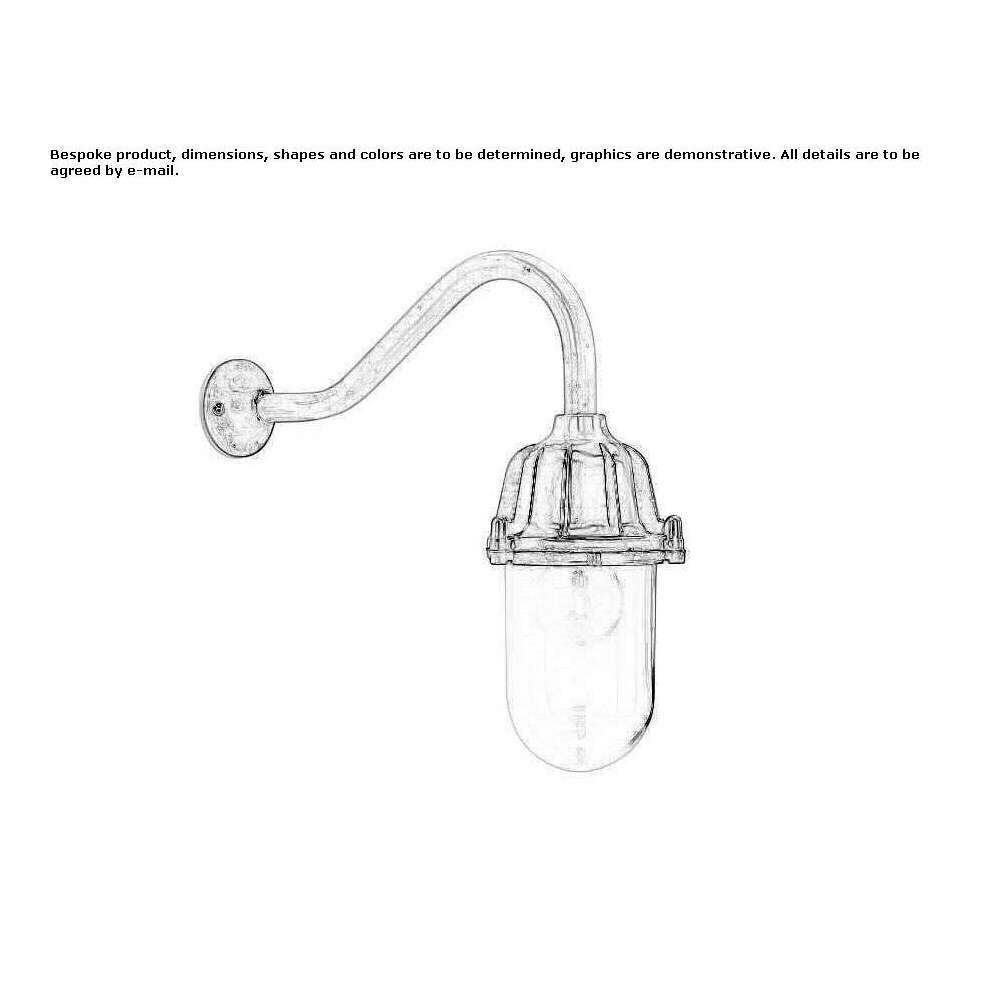 Wall lamp consisting of a wall rosette, a gooseneck arm and a lamp body made of solid die-cast aluminum. A transparent glass ball with a metal ring is attached to the lamp body with three screws. The wall rosette, the swan-neck arm and the glass frame are connected with each other using a Ø 20 mm thread. Total height, including the arm with the swan neck, 33 cm. Total diameter 12 cm. Projection 37 cm. Weight 1 kg. Porcelain socket E 27, max. 100 W. IP 65.