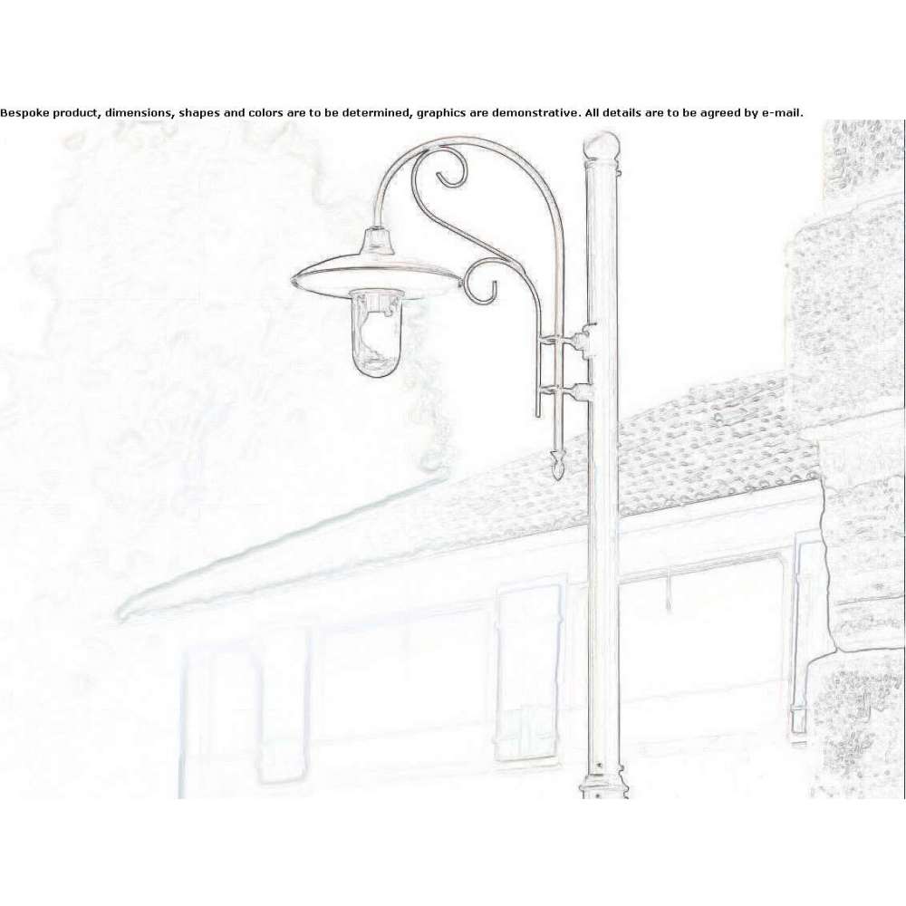 A series of outdoor wall lamps and street lamps with an antiqued copper shade, a white enamelled aluminum reflector, clear tempered glass and an antiqued brass arm. The street lamp should be integrated with poles and/or bases, which must be ordered separately. This is a set with excellent effect, which becomes a characteristic equipment of gardens, alleys and renovations.