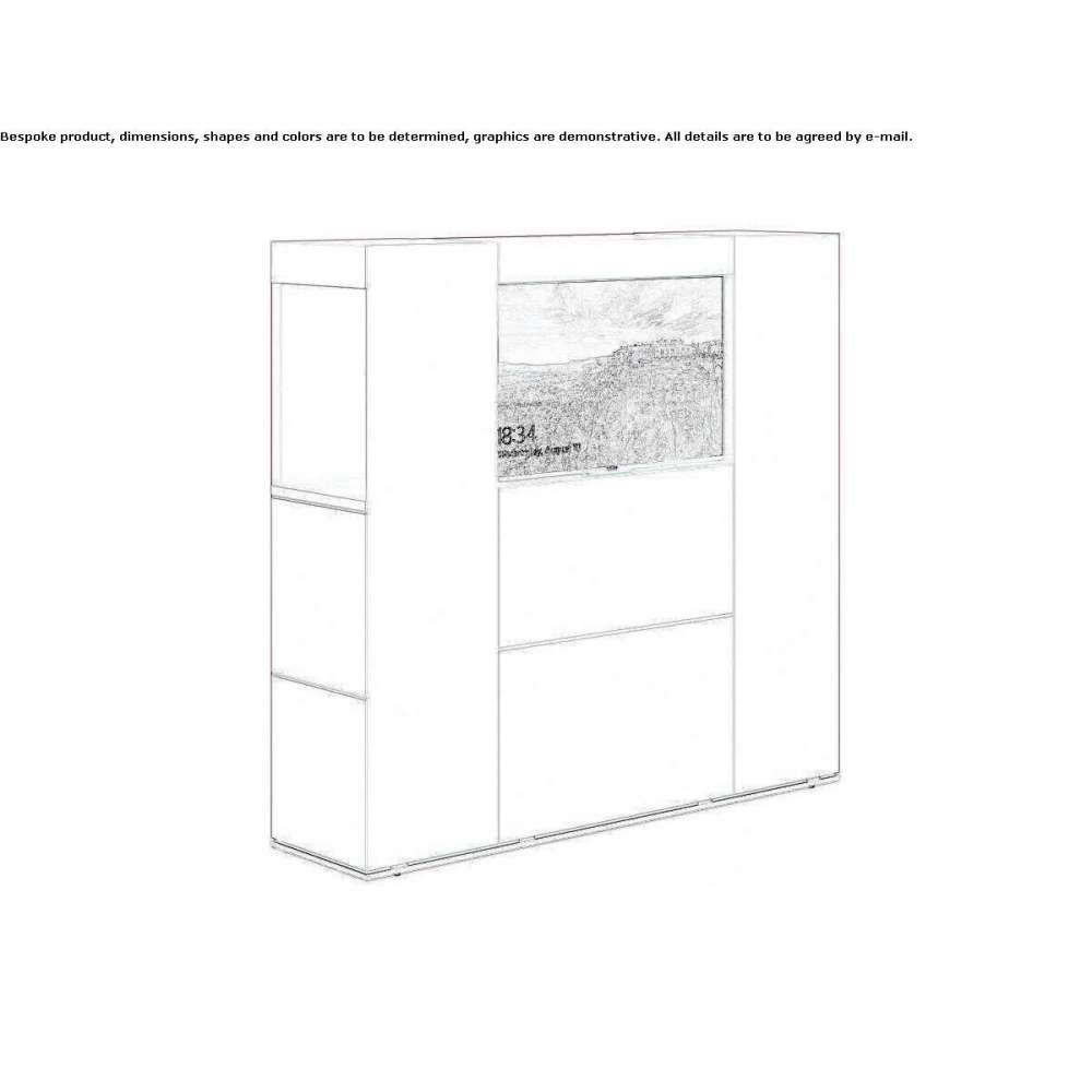 Isola Lounge, a product designed to be placed on the wall, consisting of H150 cm columns with a double cabinet and an open compartment for a coffee machine and a central technical compartment for a video monitor. This solution is also equipped with two wing columns with a hanging shelf.
