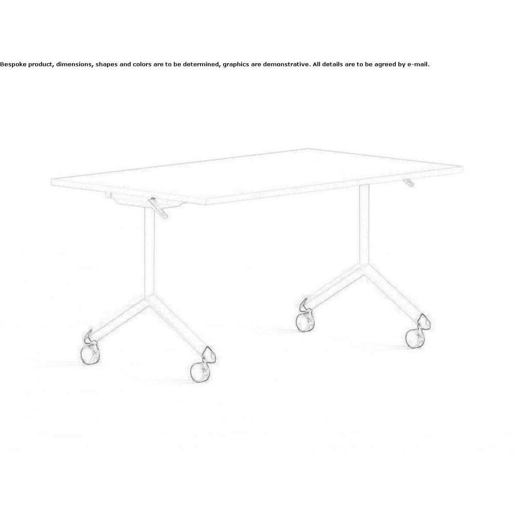 Flipaway: a table for conference applications, equipped with a laminated top and foldable wheels, provides full stackability from the front.