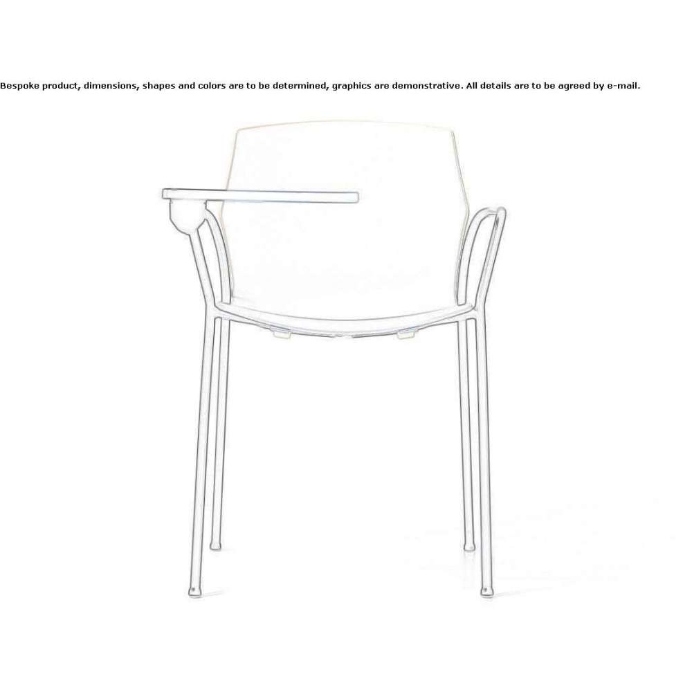 Single polypropylene shell available in 5 different colors: light blue, yellow, sand, white and dark gray. Frames on four legs or sleds, available in chrome or lacquered in white or dark gray. With or without arms. Optional: upholstered seat and tablet. Stackable up to 6 pieces.