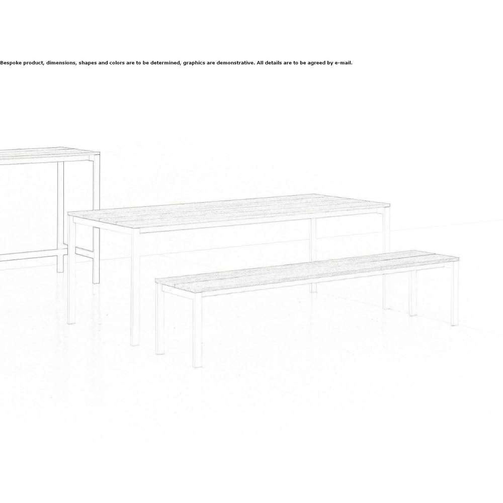 A complete collection of tables, benches and small tables for outdoor use, including a bar table or bar counter, in a simple, versatile design, with crossbars made of anodized aluminum. It has legs made of galvanized steel or powder-coated steel, also available in non-standard heights. The tabletop with 20 cm wide and 2 cm thick slats is made of teak wood from FSC-certified plantations that respect the environment. It can be left to acquire a silvery color over time or impregnated with oil to maintain its natural shade.