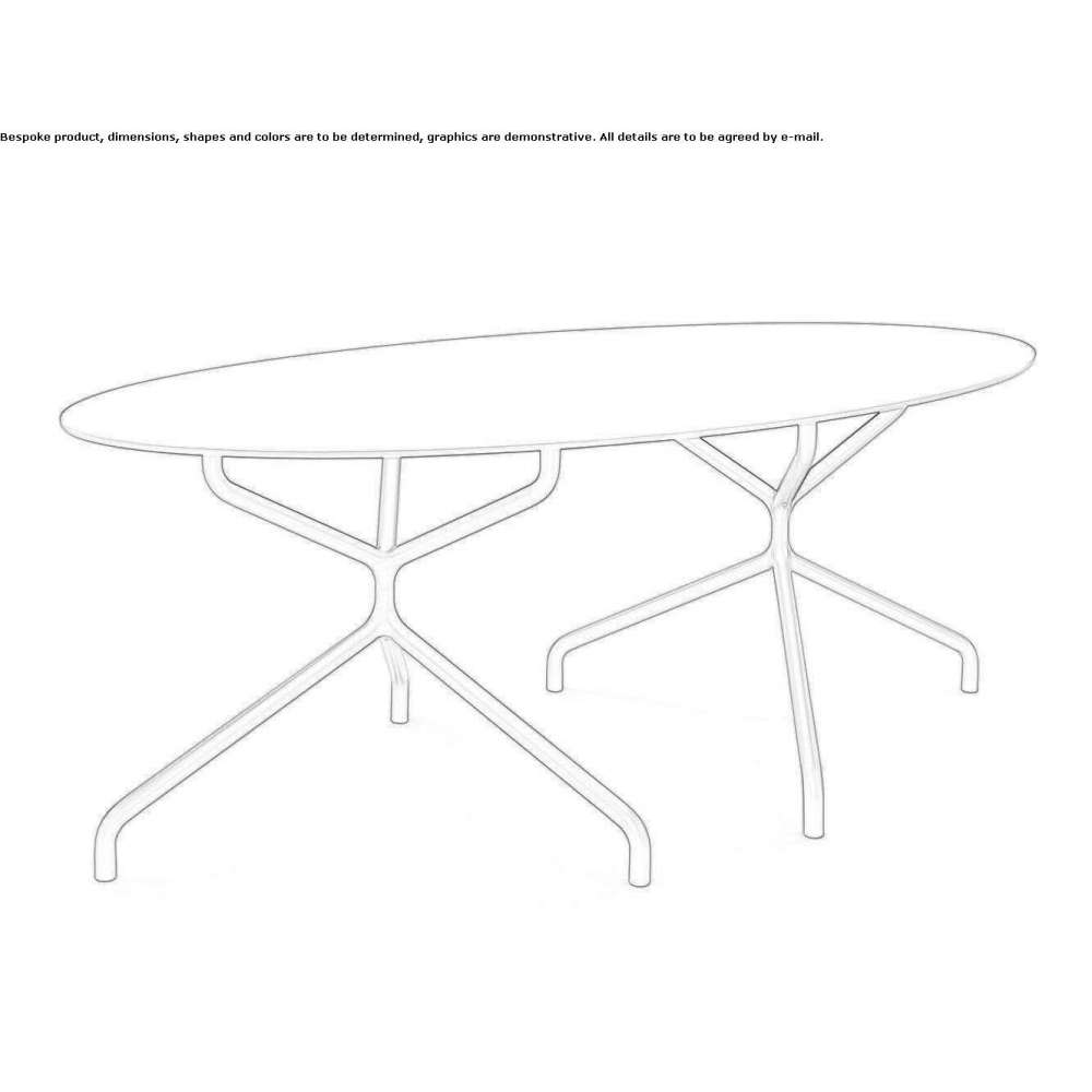 Fred is an oval table measuring 200x100 cm, with a melamine top and an epoxy powder-coated frame. Fred is a series of round or oval tables with HPL tops that can be easily removed from the supporting steel structure and stacked on top of each other. An elegant table can be achieved in a few moments thanks to two three-sided aluminum castings and seven calendered steel tubes. Fred is a table designed for contract facilities such as hotels, offices, restaurants, bars and corporate catering.
