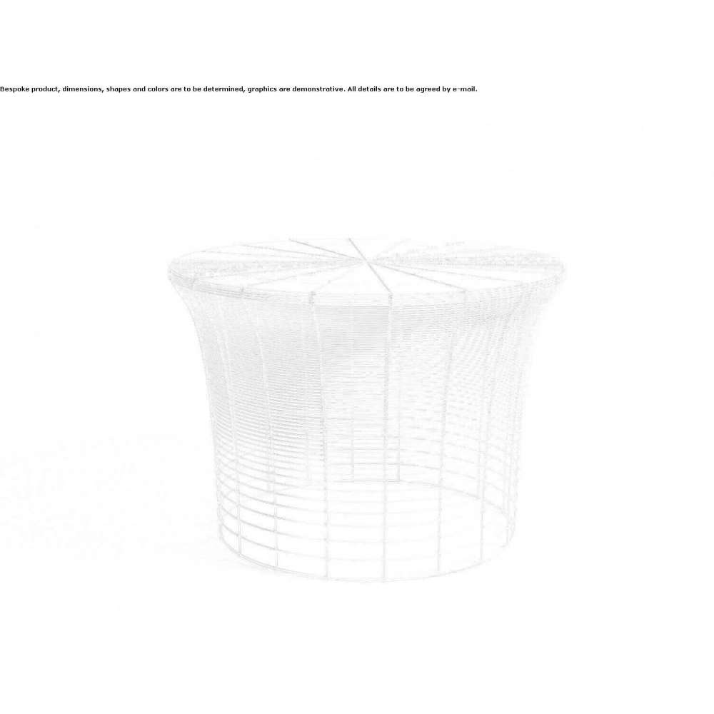 “This collection of stools and low tables is based on a traditional Indian furniture technique of weaving metal wires around a metal frame. The spacing between the wires gradually increases, creating a gradation effect. Design created by a slight change to existing technique.”