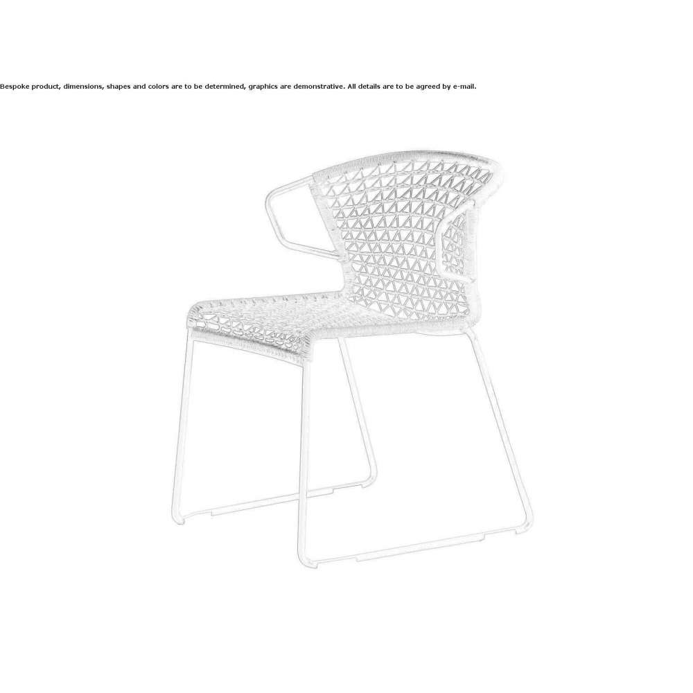 The stackable Vela chair and armchair is made of a chrome-plated or painted metal structure around which the seat and backrest are wrapped with raw marine rope or PVC. The Vela family consists of a chair, an armchair, a lounge chair, stools and a sofa. the perfect combination of design and craftsmanship: the agile structure of painted metal rod with sled legs is combined with a handmade weave that adds an element of uniqueness.