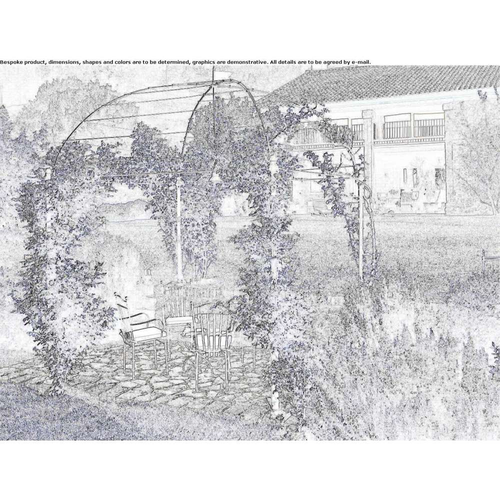 Square open-sided gazebo with an open dome-shaped roof and one central light. The structure consists of antiqued brass poles connected by antiqued brass tubes. The lighting device is made of antiqued copper. It comes with all the accessories you need to simply anchor your lawn, although you can customize it with wood, granite or bricks. The structure can be covered with a canopy, climbing plants or Indian curtains. Horizontal dimensions can be adapted to existing or specially designed spaces. A subject matter equipped with a lighting fixture containing a light bulb.