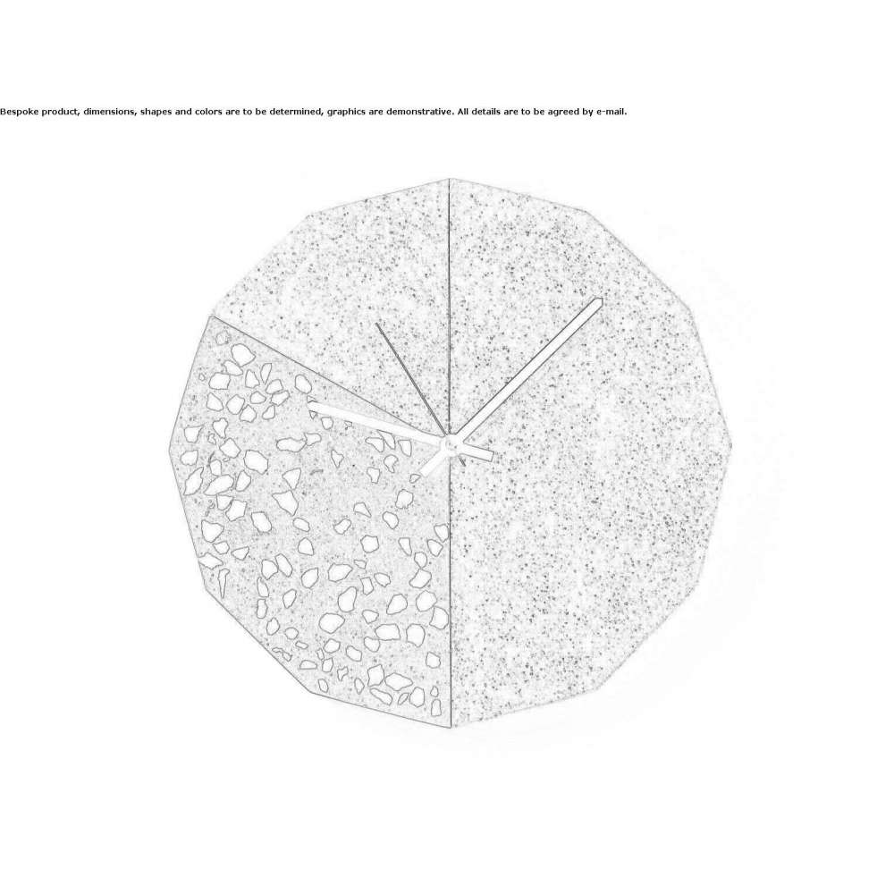 The Facet wall clock is made of colorful poured concrete. Its surface is a combination of 3 finishes. One is the familiar terrazzo finish with BLACK or WHITE cement and the other two are in sand finish. You can choose standard variants, variants, colors and finishes for each clock surface.