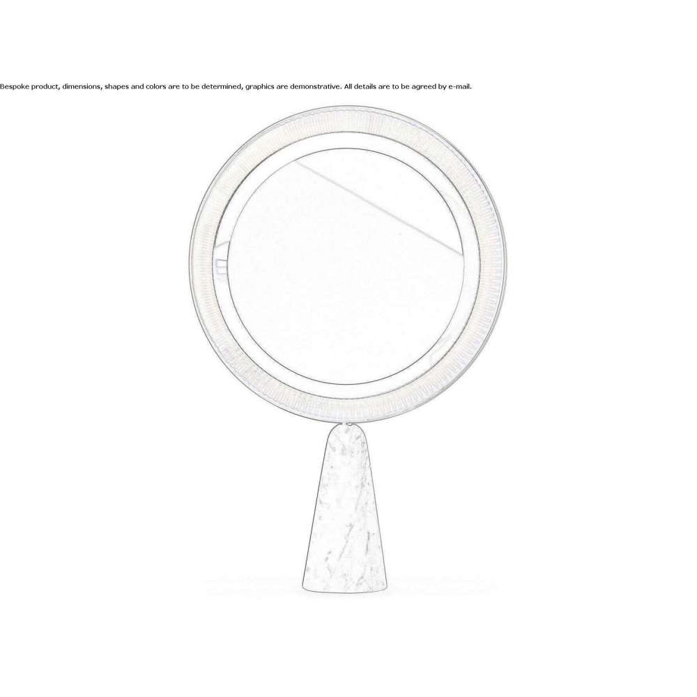 Selene is a cosmetic mirror with LED light (15 W; 108 lm/w; 3000°K). 6 mm thick bevelled mirror, extremely light. Metal parts in satin brass and base in Nero Marquinia marble.