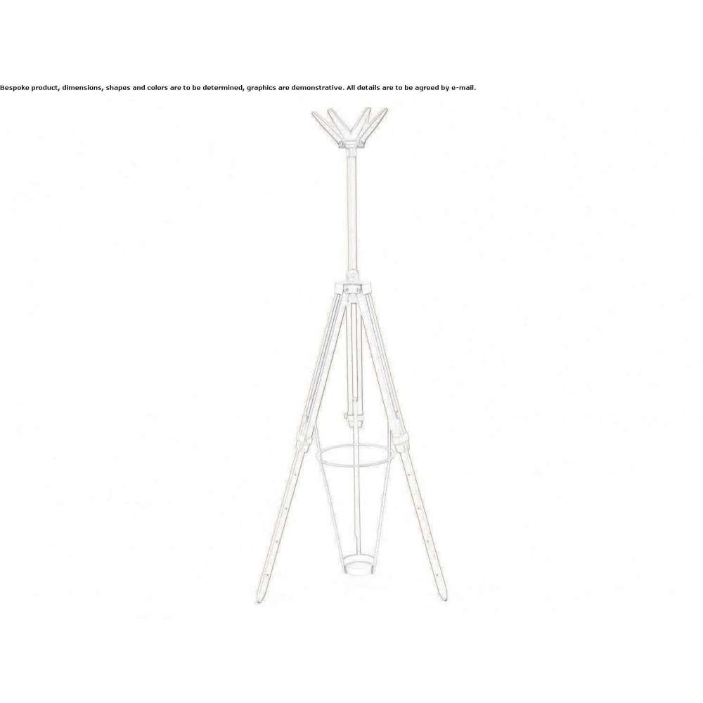 The wooden structure inspired by the artist's tripod supports a top, which can be rectangular or round, or a hanger body with six hooks and an umbrella stand. Five different heights ensuring practicality and freedom of use: laptop stand, plinth or serving table.