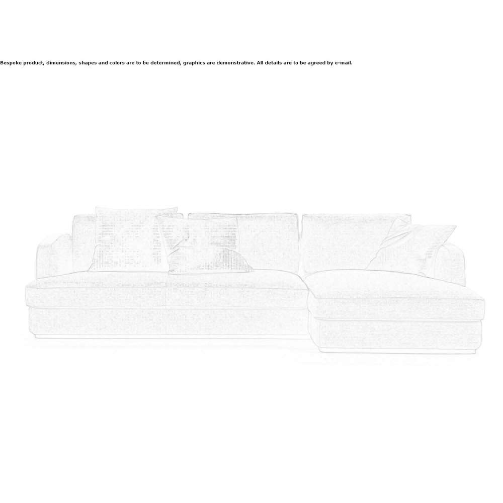 Neo-living room style for this sofa with striking proportions and depth, as well as a sumptuous, dramatic presence resting firmly on the floor. The internal structure is made of wood, and the backrest, seat and cushions are padded with soft goose down. For a wide range of possible compositions, where the end chaise longue element provides the perfect configuration. The grosgrain frames of the cushions reflect extraordinary attention to detail.