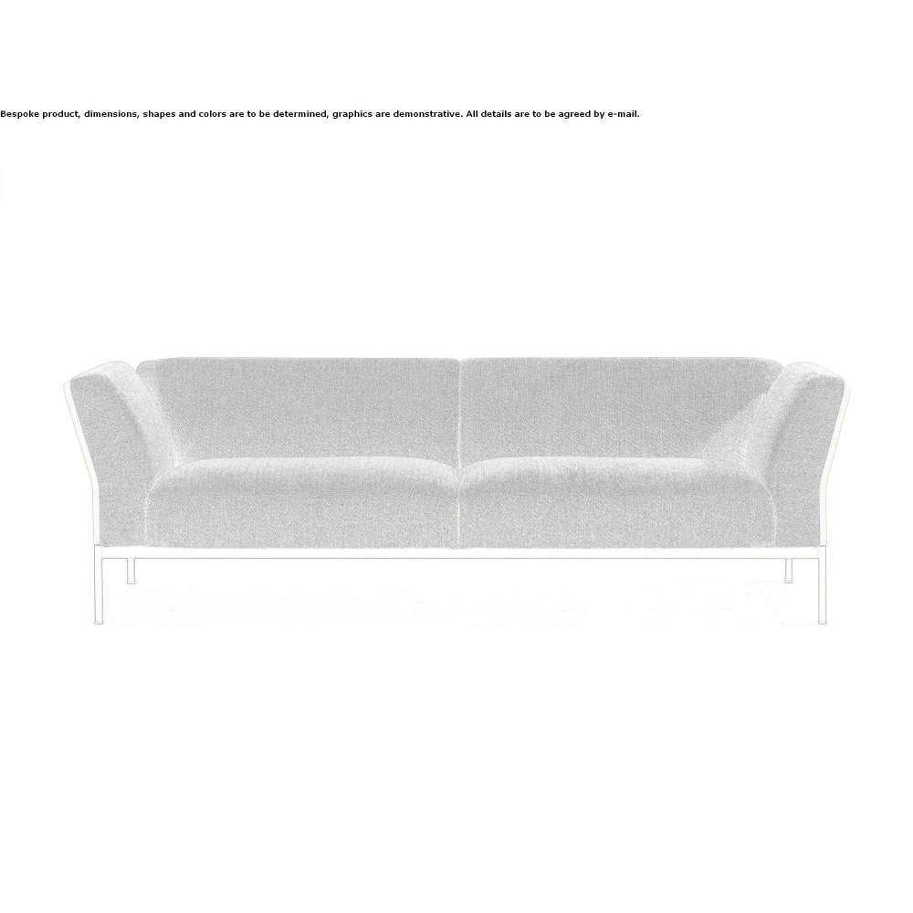 Fold is a 2-seater sofa with a wooden seat, the standard wood finish is natural oak. Other essences and non-standard RAL colors are available on request. Steel structure and polypropylene legs. Fabric upholstery. The sofa is available in 2 different seat depths. The sofa can be folded with two faces: soft for the seat and architectural for the backrest and armrests. Raised from the floor thanks to a tubular metal base with profiled legs, its wooden body appears even more solid and light despite its consistency. The wooden sides bend like a piece of paper, contrasting with the apparent stiffness of the material, to adapt to the ergonomic curve of the upholstery.