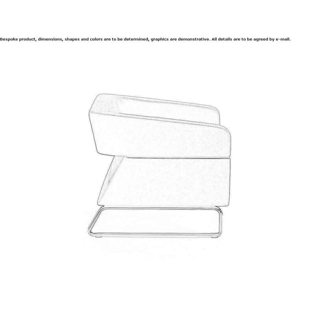 Dimensions: H: 29 9 ⁄ 16” L: 33 1 ⁄ 4” D: 31 1 ⁄ 4” H: seat 15 3 ⁄ 4” Sofa and armchair with dynamic lines, with a strong and immediately recognizable personality. The structure consists of a wooden frame covered with deformable, expanded polyurethane padding of various thicknesses and polyester fibers, with a seat on a plywood board. The base of the sled is made of chrome-plated metal; the small armchair is also available with a swivel base and metal arms. They have non-removable fabric or leather upholstery.