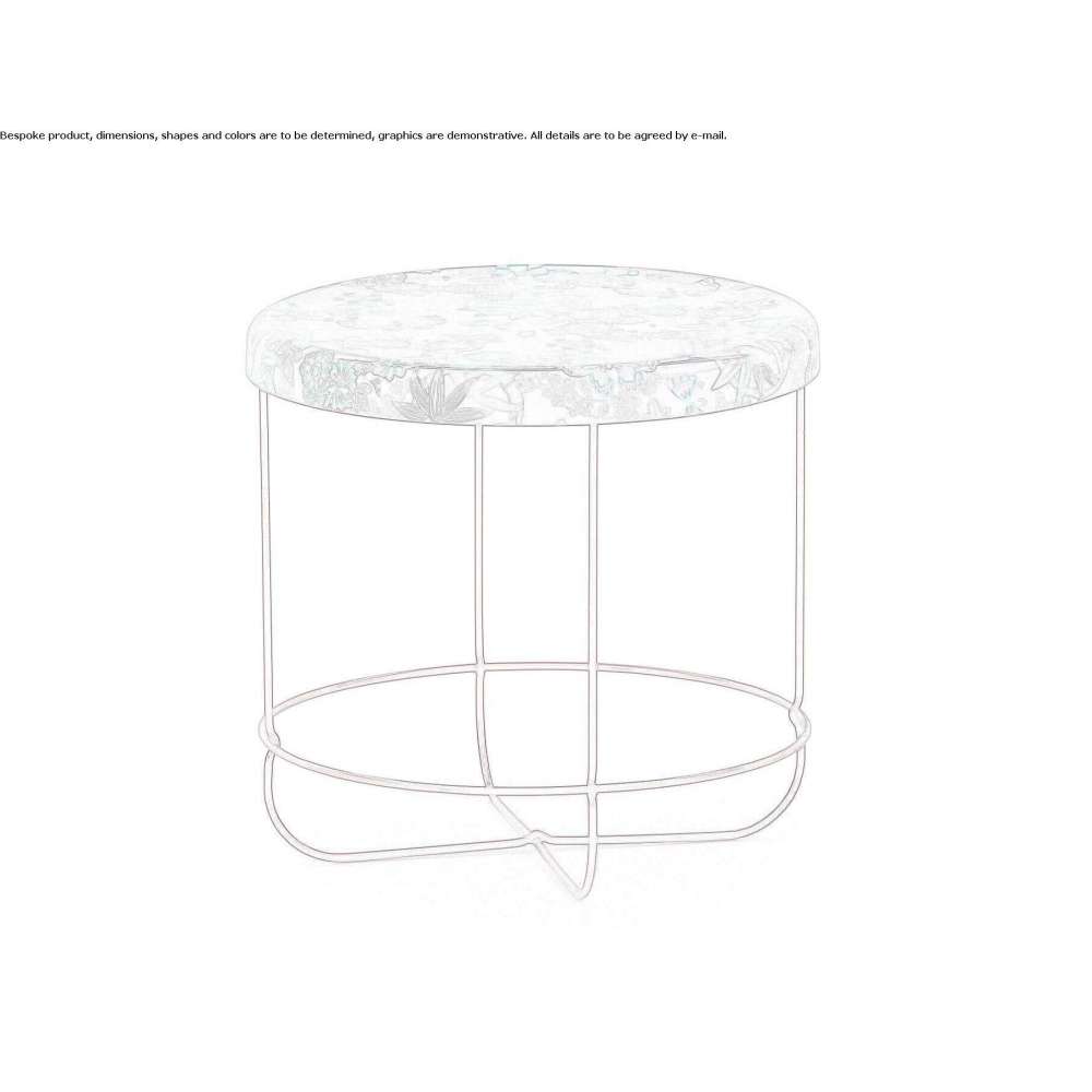 The base is made of steel pipes powder-coated in the color of shiny red RAL 3003, the tops are molded from polyester resin with embedded traditional kimono fabrics; The round top can be turned over and used as a tray.