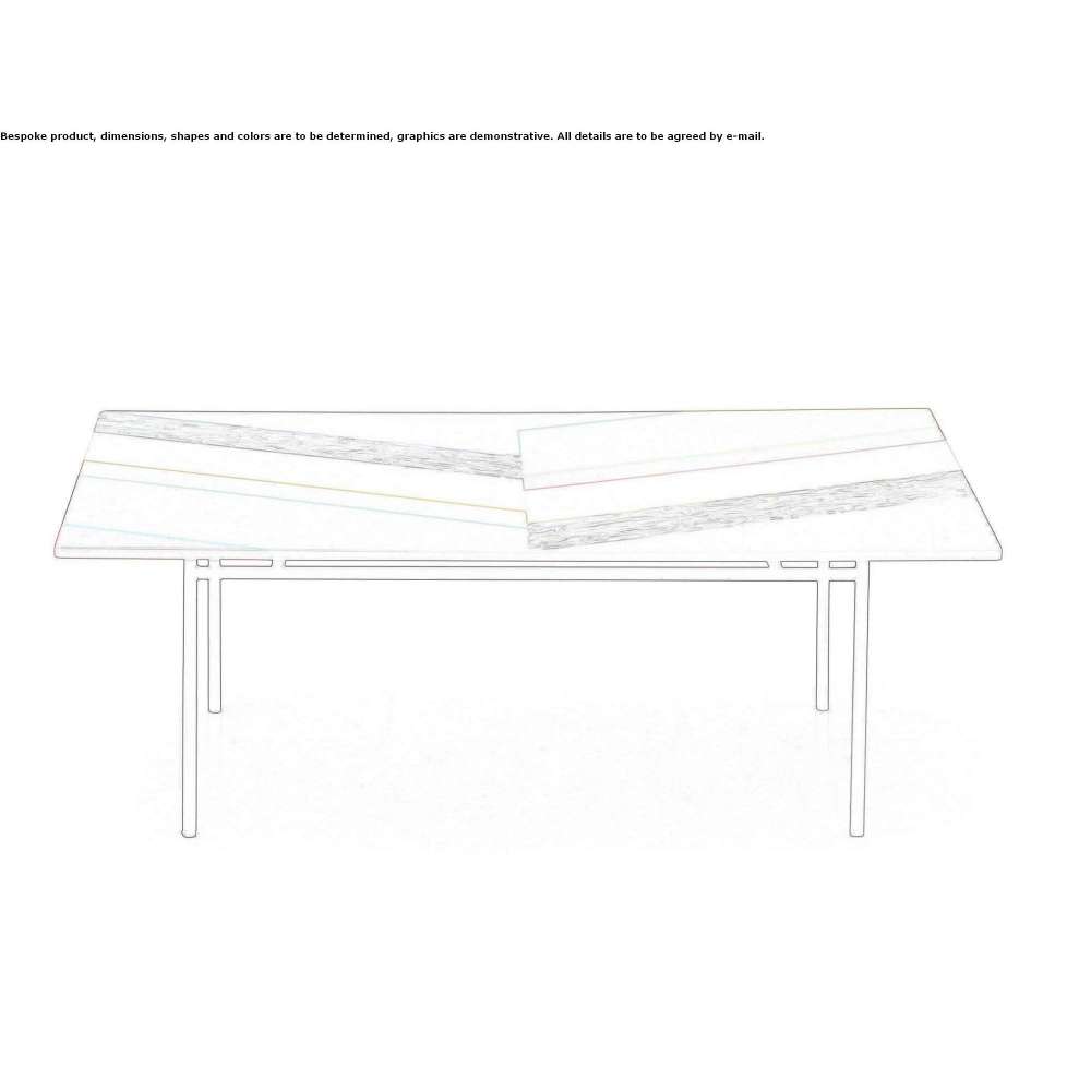 Fishbone is a low table with tops made of hand-decorated Sintetica® methacrylate. Cut and arranged according to the drawings shown on the next page. The base is made of tubular steel with a matte black powder finish; black polypropylene glides.