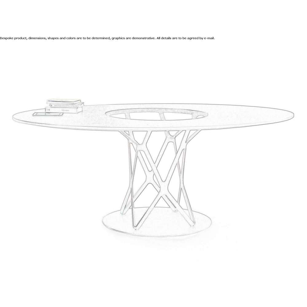 collection of tables created for Estela by the French designer Patrick Norguet: the whole family consists of an iconic base playing on the repetition of an aluminum module with an organic design. The cast base can be supplied galvanized, chrome-plated or painted white or black. The glass top can be round or elliptical and can have an ultra-clear, white-painted or black-back-painted finish.