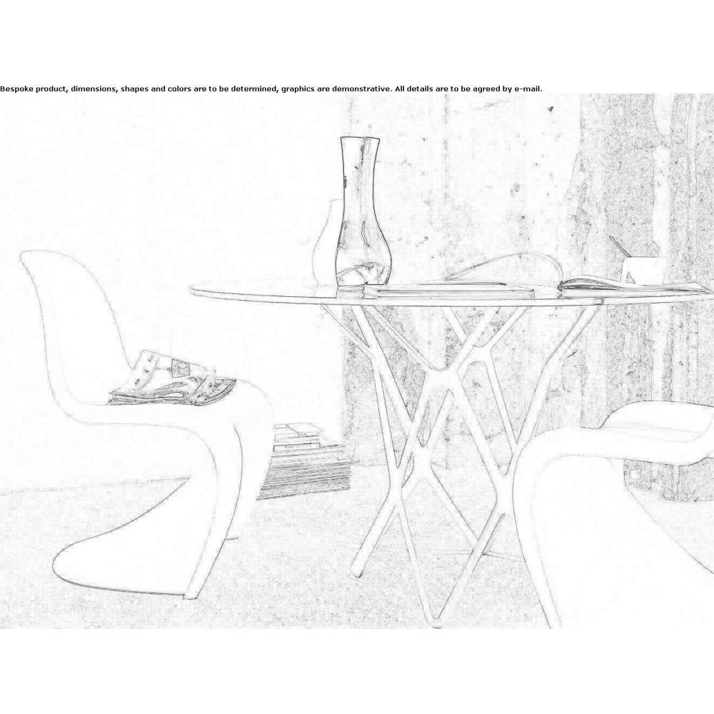 collection of tables created for Estela by the French designer Patrick Norguet: the whole family consists of an iconic base playing on the repetition of an aluminum module with an organic design. The cast base can be supplied galvanized, chrome-plated or painted white or black. The glass top can be round or elliptical and can have an ultra-clear, white-painted or black-back-painted finish.
