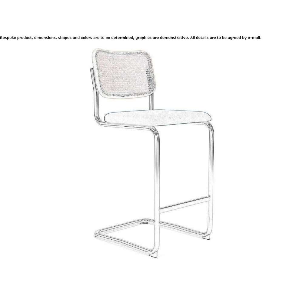 Cesca is a barstool. The seat is made of urethane foam on molded plywood. The back is made of beech wood with woven reed inserts. The frame is made of 1 inch diameter round chrome plated steel tubing with a polished finish. Plastic pads protect the floor and prevent the stool from tipping forward. The KnollStudio logo and Marcel Breuer's signature are embossed on the base of the chair. Marcel Breuer combined traditional craftsmanship with industrial methods and materials, making tubular steel furniture an international sensation and a modern institution. The cantilevered form takes advantage of the material's inherent capabilities and provides additional flexibility and comfort to the chair.