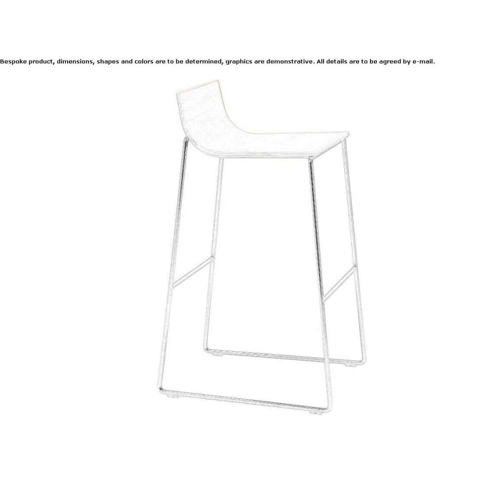 Bar stool with seat and backrest made of oak board and polished chrome steel base. Possibility of making a fully upholstered shell or parallel upholstery seams. Optional upholstered seat cover or upholstered ear cup cover. Stackable chairs, armchairs and lounge chairs with oak plywood or upholstered shell and steel sleigh base with polished chrome finish. Bar stool versions are available with a 4-legged solid beech wood base, a steel sled base with a polished chrome finish, or a 4-legged steel swivel base with a polished chrome finish. The stools are offered in 2 different heights. Optional upholstery with parallel seams and optional upholstered arms. Optionally, an upholstered seat cover or an upholstered shell cover.