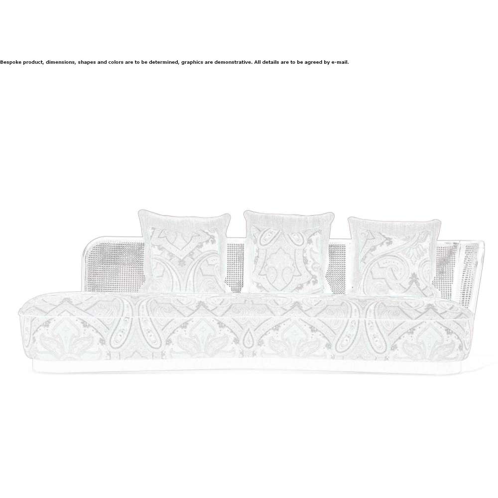 Striking a perfect balance between linearity and movement, classicism and modernity, the Caral sofa is characterized by an elegant, comfortable and dynamic design. The nomadic spirit and suggestions of travel at the heart of the new collection are enhanced by the presence of cushions inspired by various ethnic styles, creating a comfortable and refined corner sofa in the perfect style of ETRO Home Interiors. Curved multi-layer wood base with a brushed dark brown finish. Seat made of multi-layer wood and expansive polyurethane foam of variable thickness. Upholstery and trim in fabric or leather from the collection. Backrest in Vienna straw in colors from the collection, attached to a frame of solid beech wood stained matte dark wengé, turned and numerically controlled. Closed wicker trim in the color of Vienna straw. Backrest cushion made of goose down. Upholstery and trim in fabric or leather from the collection. Other finishes and upholstery available to order from the Etro Home Interiors collection.