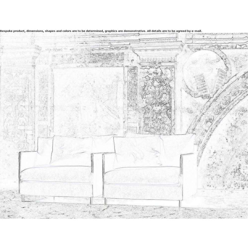 Sofas and armchairs. Supporting frame made of painted pipes and drawn steel. Seat frame made of fir wood, cushioned with elastic straps. Backrest and armrest frames made of flexible structural material. AISI 304 stainless steel legs, height 13 cm, satin finish. Shell covering made of 100% polyether thermally bonded to a polyamide velvet base. Seat and backrest cushions made of washed and sterilized goose down, divided into separate sectors, with a polyurethane foam insert. Armrest cushions made of washed and sterilized goose down, divided into separate sectors. Covered in all leathers and fabrics available in the catalog. Both are fully removable. Versions with a ruffle and wooden legs are also available on request. Seat depth 61-81 cm.