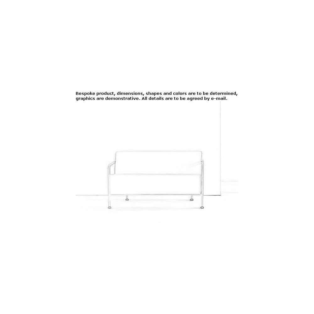 The upholstered piece, whether an armchair or a pouffe, is stylishly held by a radius metal structure in a continuous piece with curves and counter-curves at ninety-degree angles. In the case of armchairs, the structure includes armrests. Optional wooden armrests in oak or dark oak.