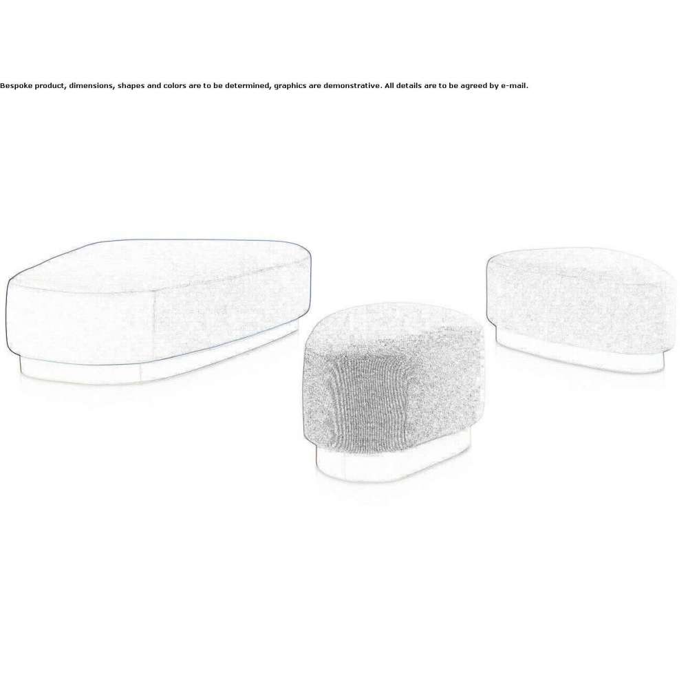 Island is a collection of three pouffes with organic forms that bring to mind the coastline lapped by the sea. This image is felt throughout the design, evoking the surrounding movement of the tide that softens and shapes the shore. For this reason, solids are perceived differently depending on the perspective from which they are observed in space. The base visually raises the seat above the ground, giving the impression that it is floating in space.