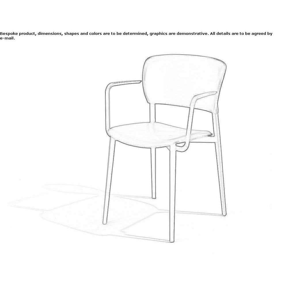 A stackable chair with a steel frame. Seat and backrest in glass fiber reinforced polypropylene, also available covered with cowhide or cuoietto. Polypropylene is anti-UV stabilized. Steel legs in the shape of a cone with a triangular cross-section. Also available as a stool with or without armrests.