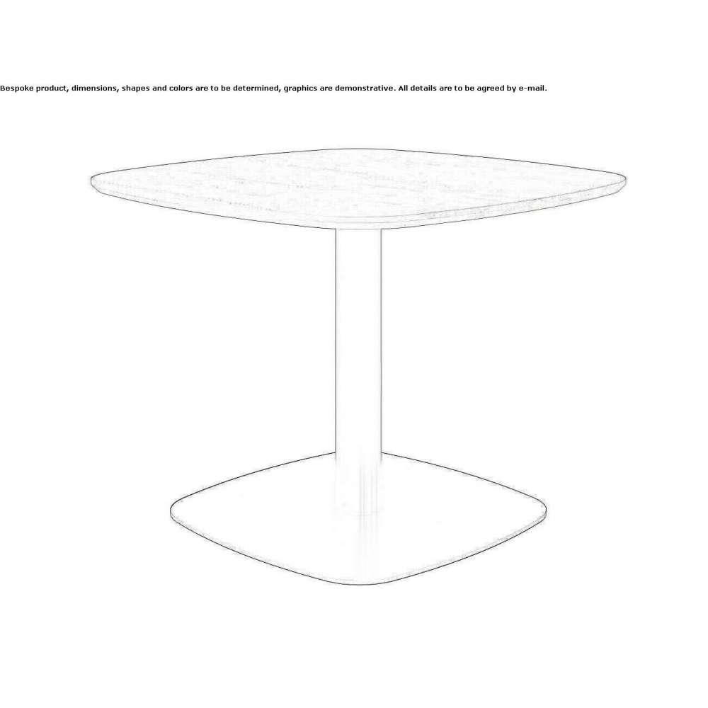 The Toffee series, table and coffee table, has a rounded veneered wood top that adds a soft touch. The black stand and the sheet metal base underneath it fit perfectly into the overall minimalist look.