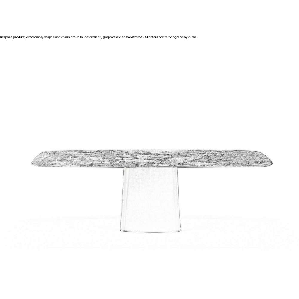 The ICON table is marked by a central pillar. The positive geometries of the side surfaces and the convex shape of the plinth create graceful, elegant forms expressing poetic simplicity. The texture of the "invisible gray" marble top, contrasting with the smooth surface of the plain metal of the pyramid plinth, provides unexpected balance and a meaningful identity.