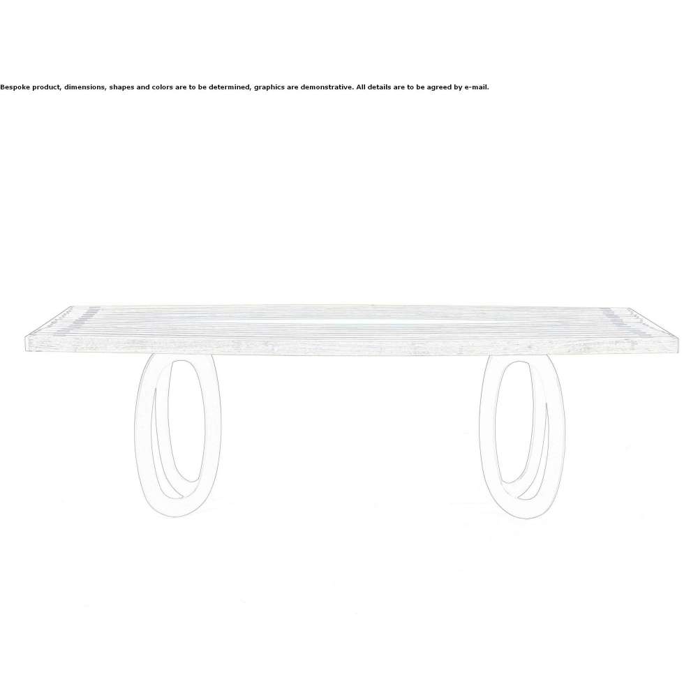The Hypnotic table has a top consisting of a combination of several curved planks replaced with black resin inserts. The legs, each composed of two oval iron rings, echo the curved shape of the upper slats.