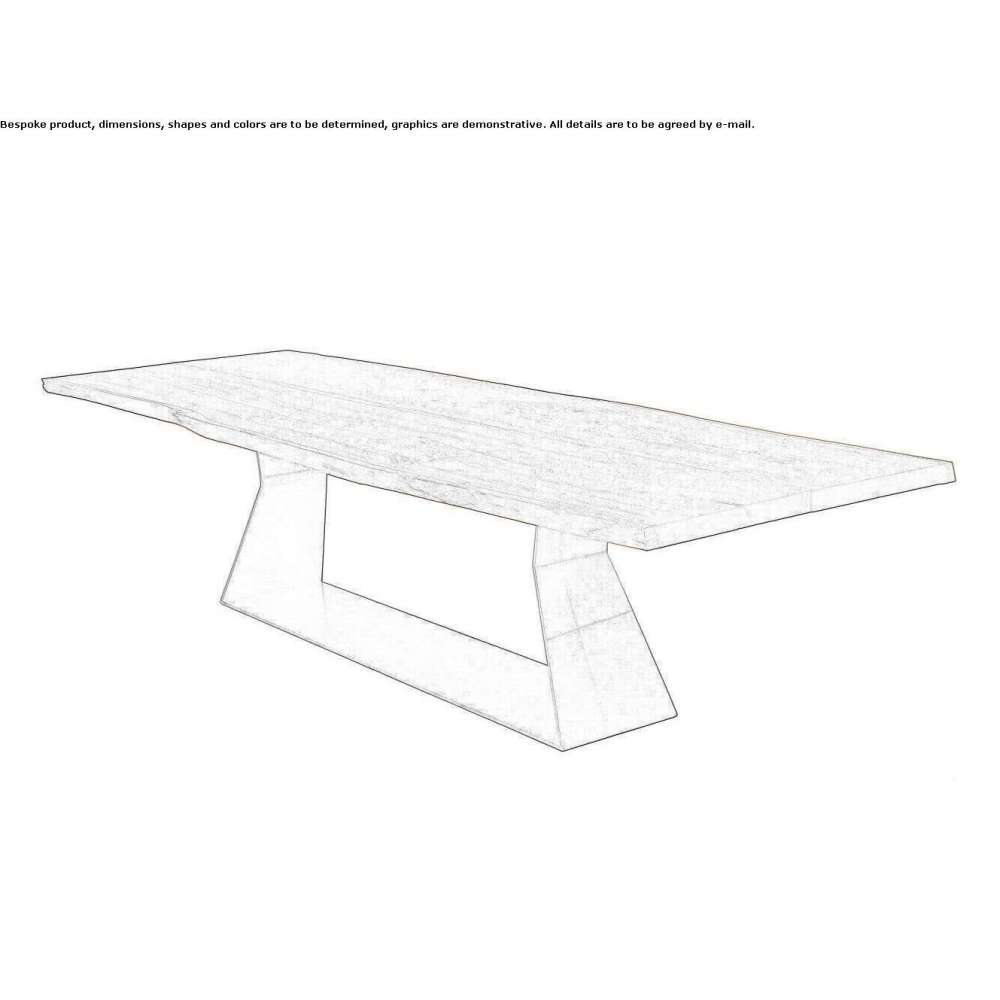Bedrock Plank C is a table with a solid wood top, consisting of two single planks placed in one line, with a central slot and natural sides. On request, available with asymmetric boards, offset by 30 cm (Bedrock Plank B). Iron plate base characterized by geometric lines.